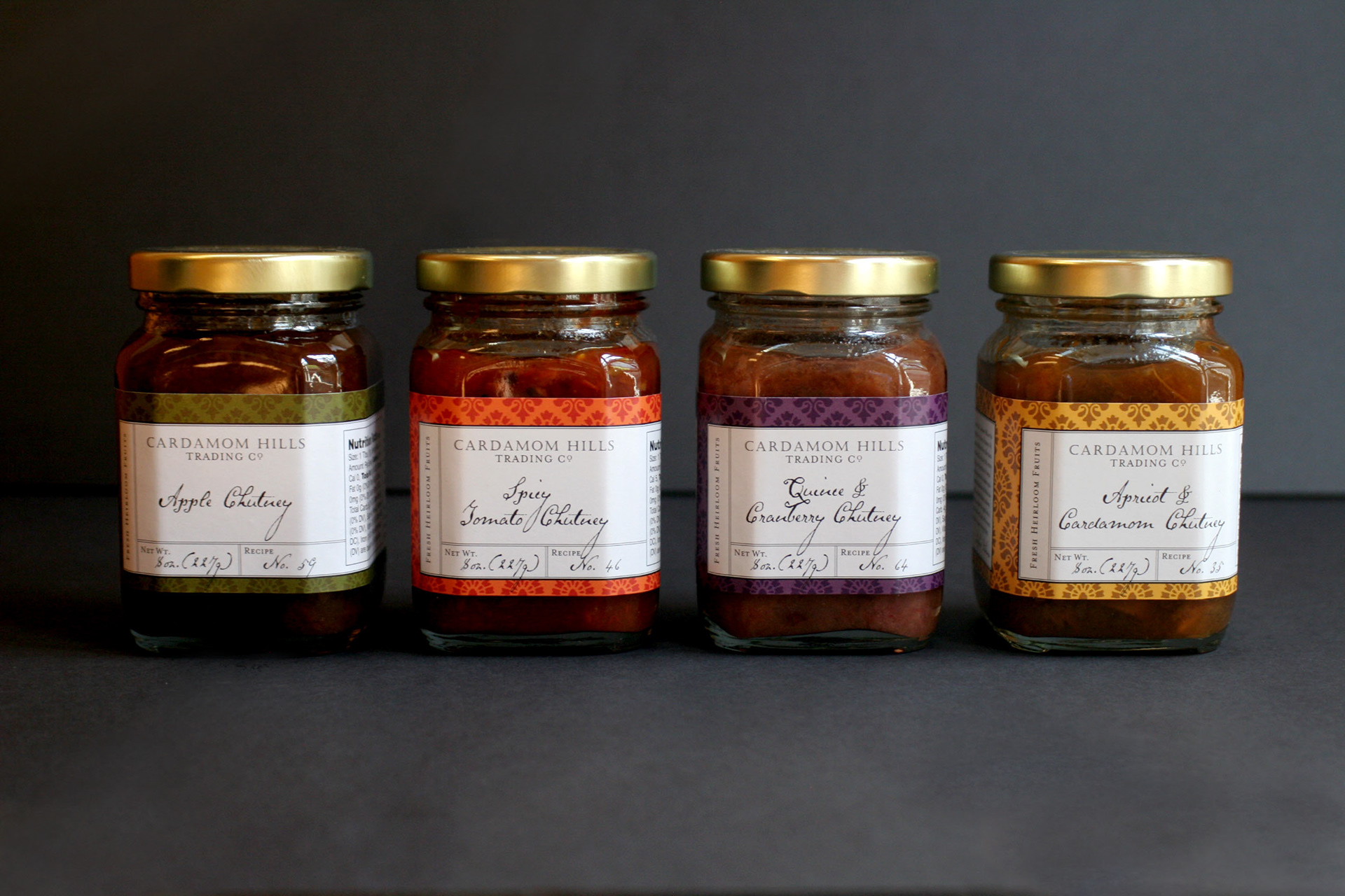 Combining fresh heirloom fruits of the Pacific Northwest with exotic spices of India, Cardamom Hills Trading Company chutneys represent a crossroad of cultures. The brand draws its inspiration from southern India’s Cardamom Hills, where the founder’s grandparents established their coffee plantation during British colonial rule. The chutney recipes are British adaptions of the venerable Indian condiment and use only fruits grown near the founder’s adopted home of Portland, Oregon. The branding and packaging design sought to evoke British colonial India while presenting a sophisticated and distinctive line of Pacific Northwest chutneys.